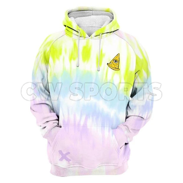 Give your favorite looks some colorful style with the ColorStrip Hoodie, featuring a rubber logo tab and a custom made design, crafted from fleece. This print of a pizza slice on the chest and a pastel-colored tie-dye background was designed by the talented Dora Suger Minks, a Tel Aviv based street artist in her signature style.
