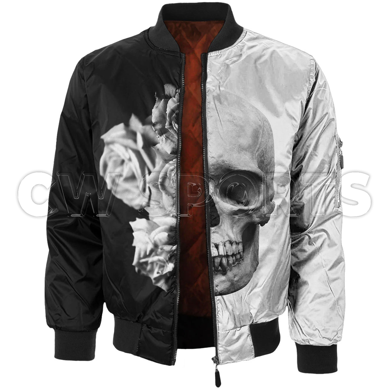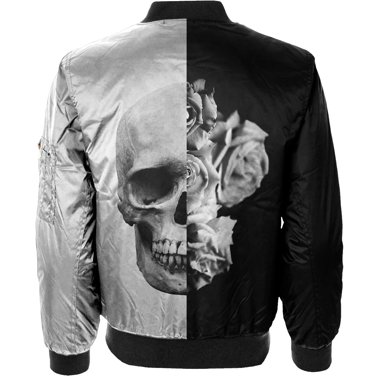 Wear our one of a kind Black & White Skull Bomber Jacket, handcrafted for fully edge-to-edge graphics. The monochrome skull design was created by our resident artists.